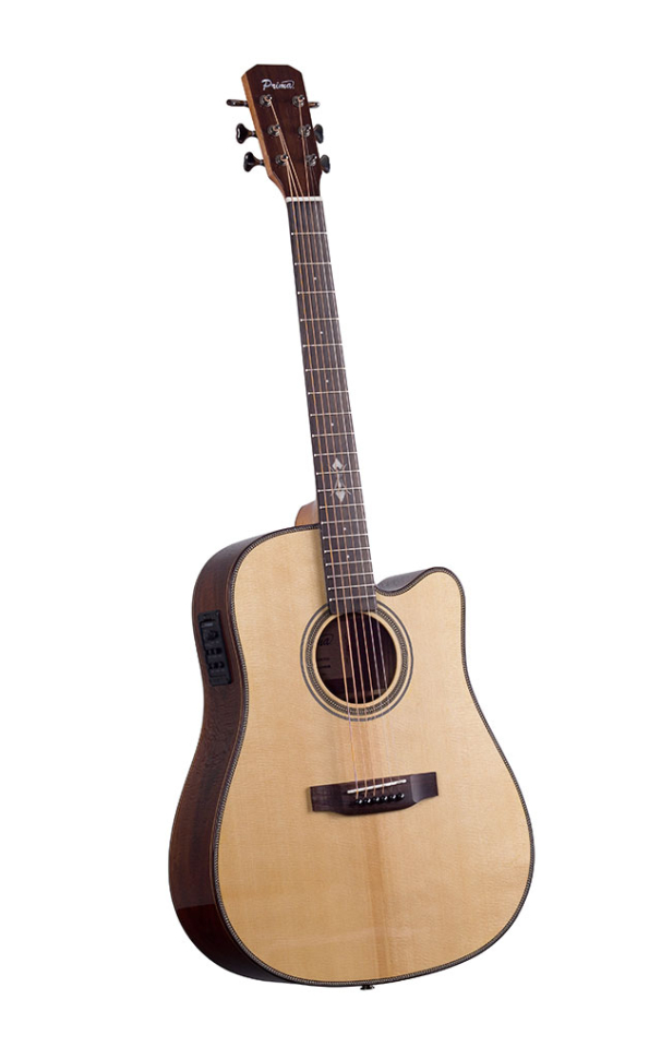 Акустическая гитара Prima MAG218CQ изготавливается из отборных материалов, обеспечивающих чистое звучание с богатыми обертонами. Классическое сочетание верхней деки из массива ситхинской ели с нижней декой и обечайкой из массива палисандра южноамериканской породы сантос, являющейся отличной альтернативой краснокнижному рио, обеспечивает идеально сбалансированный тембр, с глубокими бархатными басами. Сочленение корпуса с грифом в районе 14 лада в сочетании с вырезом-катавэем позволяет максимально легко и без препятствий добираться до высоких нот, а изготовленные по лицензии Gotoh колки с удобными бутонами обтекаемой формы, мягкой и плавной закрытой механикой, надёжно держат строй. Гитара покрыта тонким слоем глянцевого лака и имеет роскошный внешний вид. Гитара оборудована подпорожковым пьезозвукоснимателем, микрофоном и блоком активной электроники от ведущего производителя бортовой электроники, американской компании Fishman. Предусилитель Fishman Presys Blend имеет на борту трёхполосный эквалайзер, регулировку микса звукоснимателя и микрофона, подавитель обратной связи, фазоинвертор и хроматический тюнер.